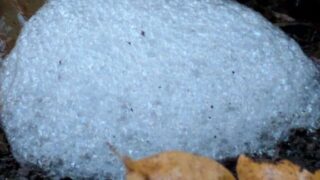 今朝、再び森の中で、樹幹流によるものと思われる泡に出会えました。