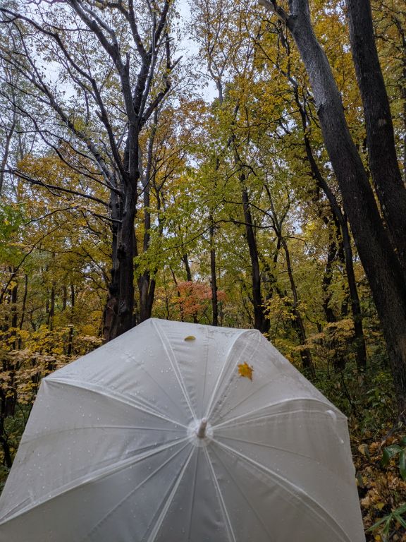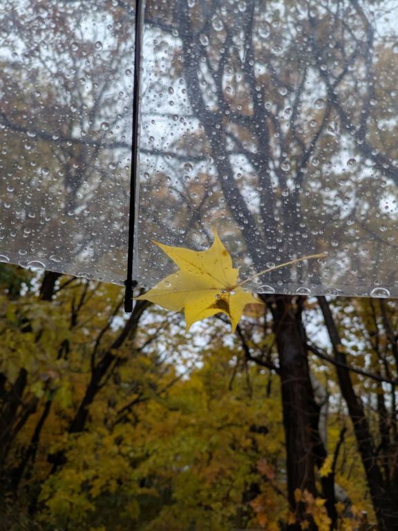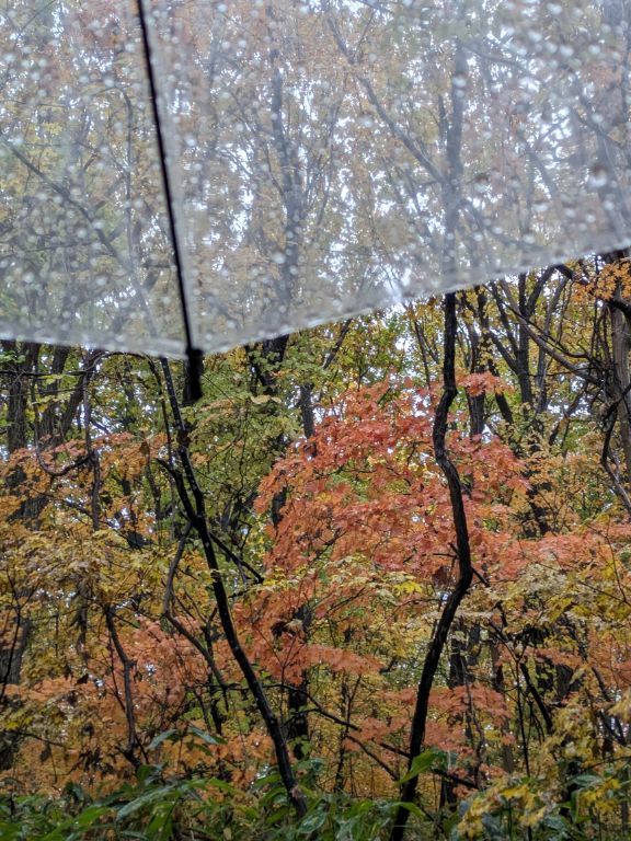 雨に打たれて黄葉が落ちてくる。それがたまに傘に止まると幸運じゃないかと思えてくる。