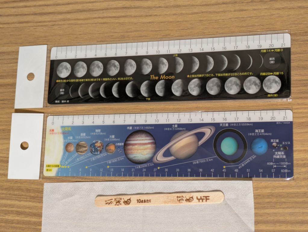 昨日科学館で、博士煎餅を買わずに、買った物がこちら。月齢定規と太陽系定規。こういうのは昔から買わずにはいられない性分です。